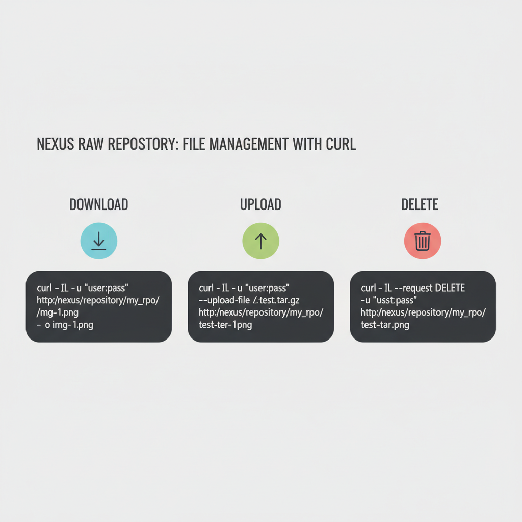 $> curl -IL -u 'test:test123' --upload-file ./test.tar.gz http://192.168.10.10:11000/repository/test_repo/test.tar.gz - test_repo에 있는 test.tar.gz 파일 삭제